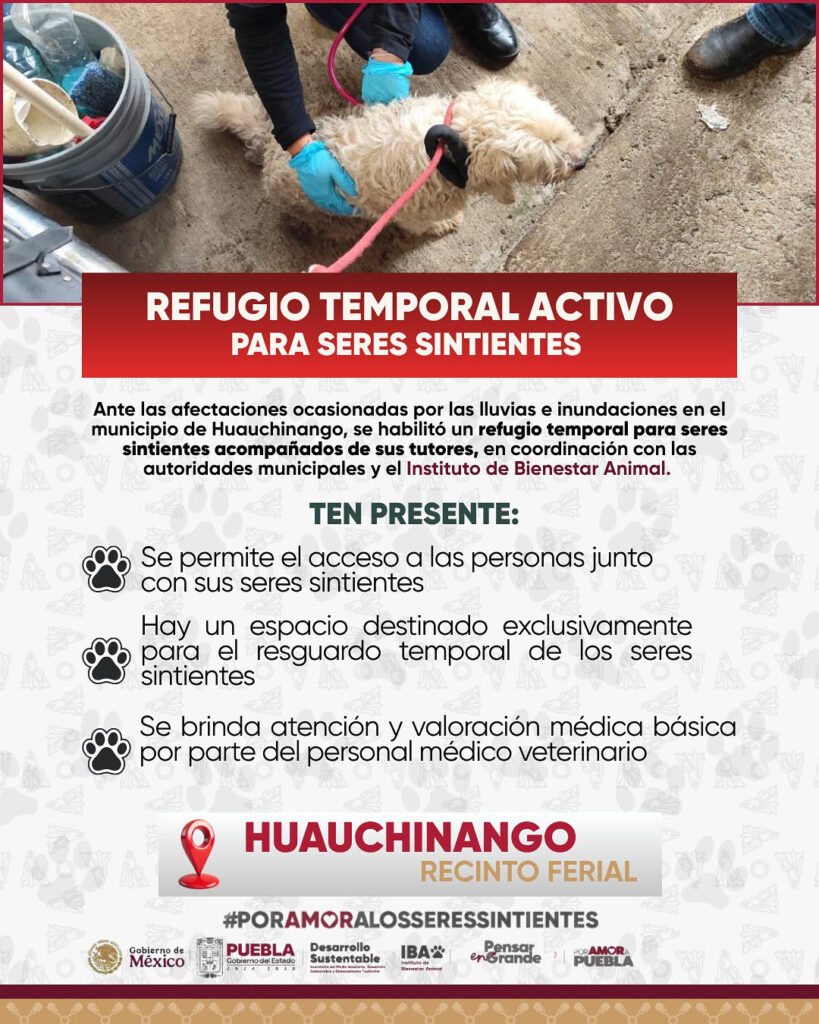 El Gobierno de Puebla, a través del Instituto de Bienestar Animal, brinda atención médica y resguardo temporal a animales afectados.