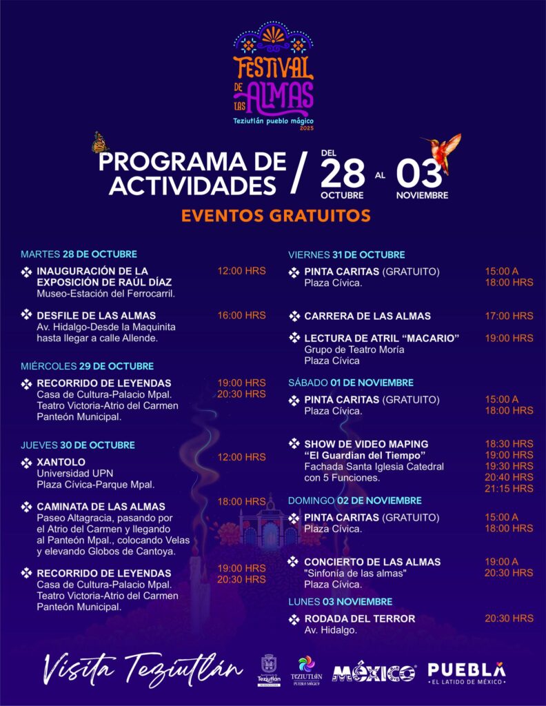 Durante esta edición, los asistentes podrán recorrer calles engalanadas con altares y ofrendas, participar en talleres interactivos, disfrutar de presentaciones musicales y sumergirse en diversas actividades familiares. La gastronomía tradicional también será protagonista, con platillos como tamales, mole, pan de muerto y calaveritas de azúcar, permitiendo que los visitantes experimenten los sabores típicos de la región mientras celebran la vida y la memoria de quienes ya no están. Cada elemento del festival refleja la identidad de Teziutlán y su compromiso por mantener vivas las tradiciones mexicanas.
